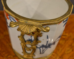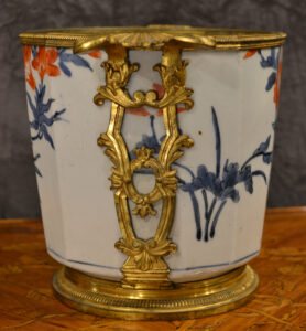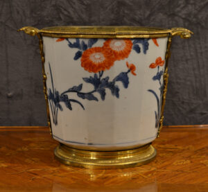 Les amateurs européens se disputaient les productions orientales, chinoises ou japonaises, depuis le XVIIème siècle. Au début du XVIIIème, les porcelaines si prisées furent souvent enrichies de montures d’argent ou de bronze doré afin de les magnifier mais aussi de transformer leurs formes ou leurs usages.